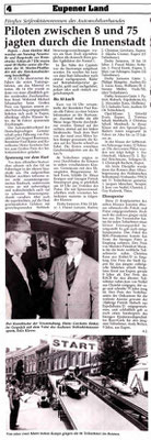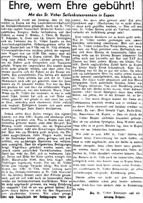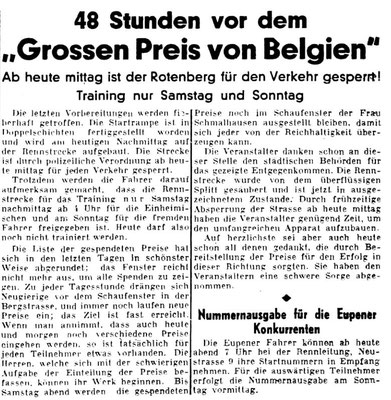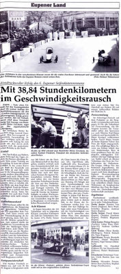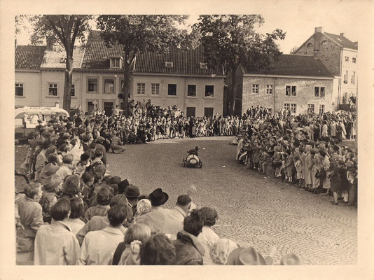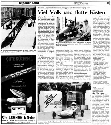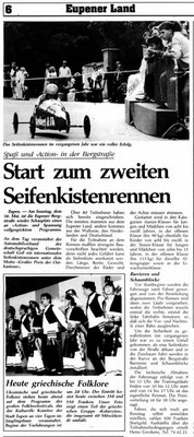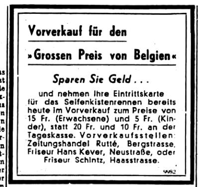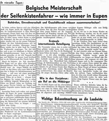 Am Renntag selbst war die Begeisterung groß, so dass auch kleinere technische Probleme mit tatkräftiger Hilfe aus der Bevölkerung behoben werden konnten: „Durch unglücklichen Zufall hatte in Eupen der kleine Karly Even aus St. Vith Achsenbruch. Eine Ausscheidung war für ihn so gut wie sicher. Da erbot sich ein unbekannter Herr (er wollte seinen Namen nicht nennen) unaufgefordert, den Schaden zu beheben. Die Achse wurde abmontiert und dem Herrn mitgegeben. Nach anderthalb Stunden Arbeit war der Wagen wieder fahrbereit. Von einer Bezahlung wollte der edle Helfer nichts wissen. Seine Antwort lautete: Ne: Soviel Sportgeist muss man schon haben, um jedem, der in der Klemme ist, zu helfen. Kein Wunder also, wenn alles in so guten Händen lag, dass beim Seifenkistenrennen in Eupen alles wie am Schnürchen funktionierte.