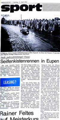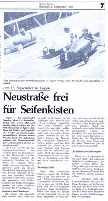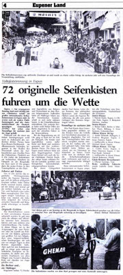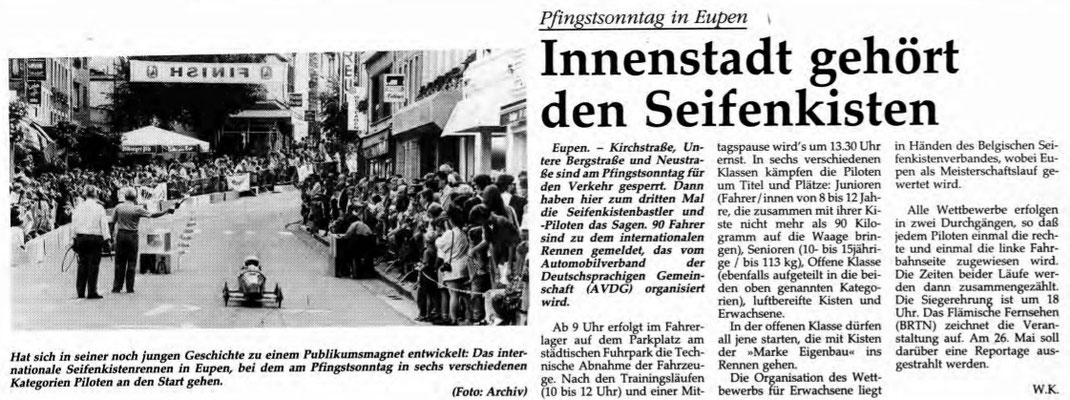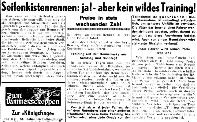 Anfang der 50er Jahre fanden in Eupen Seifenkistenrennen u.a. am Rotenberg und an der Malmedyerstraße statt. Jüngeren Zeitgenossen dürfte die spätere Version der 90er Jahre die Neustraße hinunter in Erinnerung sein.