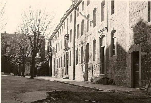 Der sehr harmonisch gestaltete dreigeschossige Bau mit 15 Achsen stammt aus dem Jahre 1748. Er ist aus Bruchsteinen errichtet und hat blausteingerahmte Stichbogenfenster mit leicht hervortretendem Keilstein. Die Eckquadern sind aus Blaustein in Zahnschnittfolge. Im dreiachsigen Mittelrisalit befindet sich eine Stichbogentür mit schön profiliertem Rahmen, wohl der Eingang zur alten Kapelle des Hauses. Darüber sehen wir eine barocke Figurennische mit der Statue des hl. Josef, flankiert von zwei kleinen Säulen, die einen Dreiecksgiebel tragen. Den seitlichen Abschluss bilden zwei Voluten. Über der Nische befindet sich eine quadratische Aussparung, die, jetzt durch einen Strahlenkranz verdeckt, wohl in früheren Zeiten eine Uhr getragen hat. Zu beiden Seiten befindet sich in der vorletzten Achse je eine Stichbogentür mit einfacherem Blausteinprofilrahmen und kleiner Kragplatte als Bekrönung, die in das jeweilige Treppenhaus führte. Das Gebäude hatte ursprünglich nur eine Tiefe von 6,50 m und wurde durch einen späteren Anbau auf etwa das Doppelte gebracht. Das Satteldach des Vorderhauses hat einfache Fenstergiebel.