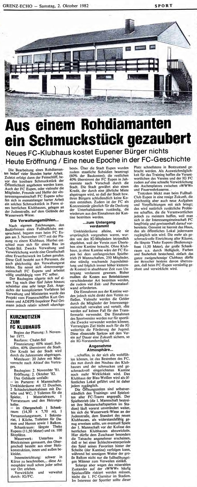 Der andere Eupener Verein, der FC Eupen, war ab 1924 vorübergehend am Panorama aktiv, bevor durch die Herrichtung der „Wiese Klever“ am Stockbergerweg der langersehnte Traum eines eigenen Geländes Wirklichkeit wurde. Die Voraussetzungen für eine endgültige und dem Verein angemessene Lösung schuf im Jahre 1931 die Familie Schins mit dem Erwerb des stark abschüssigen Geländes am damals noch unbesiedelten Stockbergerweg. In diesem langgezogenen Steilhang von der Judenstraße bis zur Klötzerbahn leisteten die Eupener in den Sommermonaten vor Beginn der Meisterschaft 1931/32 in pausenlosem Einsatz wahre Titanenarbeit.