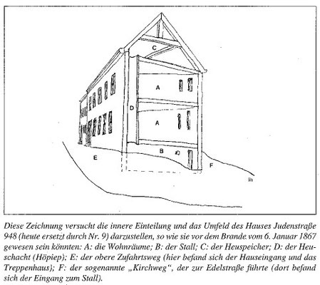 Am Sonntag, dem 6. Januar 1867, riss das Sturmgeläut aus dem Türmchen der Bergkapelle die Nachbarn aus dem Schlaf. Fast gleichzeitig ertönten die Hörner der Nachtwächter und verkündeten den Ausbruch eines Brandes. Das Eckhaus Nr. 948 an der Judenstraße, das heute die Nummer 9 trägt, brannte lichterloh, noch weiter angefacht durch einen gewaltigen Sturmwind. Haushohe Flammen und Funkengarben stiegen aus dem brennenden Haus in den Himmel. Die Nachbarn aus weitem Umkreis des Hauses eilten zur Hilfe herbei, wohl wissend, dass sich dieser Brand, durch den herrschenden Sturm, leicht auf das ganze Bergviertel ausdehnen konnte. Dennoch verging geraume Zeit bis zum Beginn der Löscharbeiten. Durch den herrschenden starken Frost waren die beiden wichtigsten Wasserstellen der Umgebung, der „Bernesch-“ und der „Heinens-Pfuhl“ so stark zugefroren, dass auch ein Aufhacken keinen Erfolg brachte. Zwei Brunnen in der Nachbarschaft waren im Handumdrehen leergeschöpft. Zudem hatte sich die Stadtverwaltung, trotz jahrelangen Herumredens, bisher nicht zu der Aufstellung einer schlagkräftigen Feuerwehr entscheiden können.