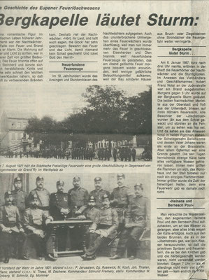 22. Am 4. Mai feiern wir den Festtag des Heiligen Florian, des Schutzpatrons der Feuerwehr. Die heutige Reportage beschreibt die Geschichte der Brandbekämpfung in Eupen. Unter anderem wird darin ein Einsatz im Bergviertel vor 150 Jahren beschrieben. Daraus entnehmen wir u.a. auch, dass die Judenstraße zu dieser Zeit noch „Jöschstroet“ hieß – ein deutlicher Hinweis auf den Bezug zur Bergkapelle, die dem Heiligen Johannes dem Täufer geweiht ist.
